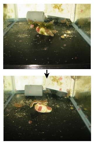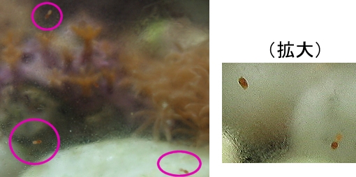試験2.(2017/7/19追加掲載) こちらは上記の試験1.の水槽の、容器の外の水槽での観察です。これは養殖サンゴのディスクコーラルの水槽 60*45*10cmの水槽が2つ繋がった(行き来可能)な養殖