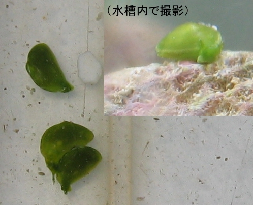 駆除効果のある生物: ◎サンゴモエビ ○エメラルドグリーンクラブ 葉幅1〜2mmの細長い、まさに羽のような藻類で、一旦繁殖すると除去が大変困難でとってもとってもすぐ生えてくる藻類です。ハギ類などに普段からかじってもらうか、 ●サンゴモエビのハネモへの効果確認 サンゴモエビは、いわゆる”ハネモ”の除去には大変効果があることがわかりました。ハネモにも種類がありますので、すべてに効果があるかは不明ですが、当方で発生 ●タツナミガイ・アメフラシの報告 ハネモは、本種のほかはタツナミガイというアメフラシの近縁種が有効と言われており、当方でも20匹程度を収容して各水槽で実験したところ、実際にいくらかは食べて