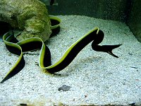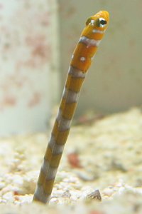 普通 | A | 砂の中に体を入り込ませて、一部をだしているおもしろい 魚で、とても臆病です。飼育水槽には、パウダー〜3番の サンゴ砂を5cm以上は敷いたほうがいいでしょう。 (ただし浅くても実際はむりやり入ります) 本種の最大のポイントは、同族(ニシキアナゴなど) でもいいので、とにかく複数飼育をすることです。 多くの方が一匹飼育でまずはじめるのですが、だめになっ てしまうことが多く、私もそうでした。 複数いると安心してよく顔をだし、エサもよくとります。 エサも水族館では多数いますが、うまく飼えているのはその ためではないかと思われます。 |